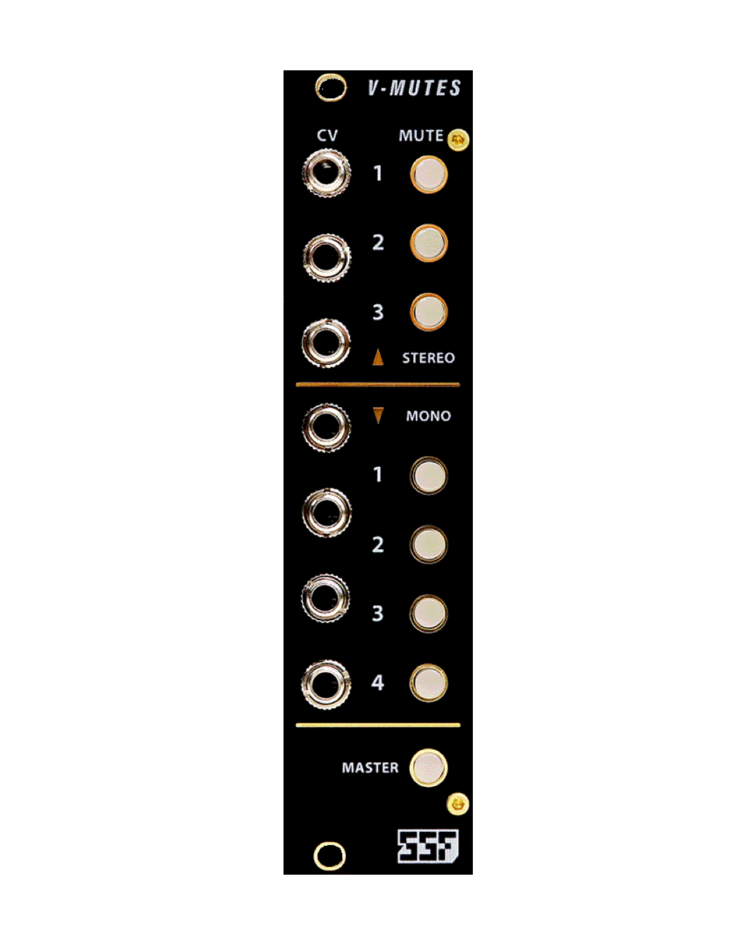 V-MUTES is an expander for the VORTICES character mixer. This module retains the full functionality of the V-CV expander that was included with your VORTICES, and adds click-less muting on all 7 of the VCA controlled inputs as well as a MASTER mute function that can mute all 7 channels simultaneously.